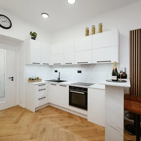 Das Luxury Musicians Apartment In Central Prague By Metro Vysehrad ist mit Selbstversorgungseinrichtungen ausgestattet, einschließlich einer Küche mit einem Kühlschrank, einem Herd und Glasgeschirr. Das Apartment liegt ca. 5 Minuten Gehweg von der Bushaltestelle Hochburg entfernt.